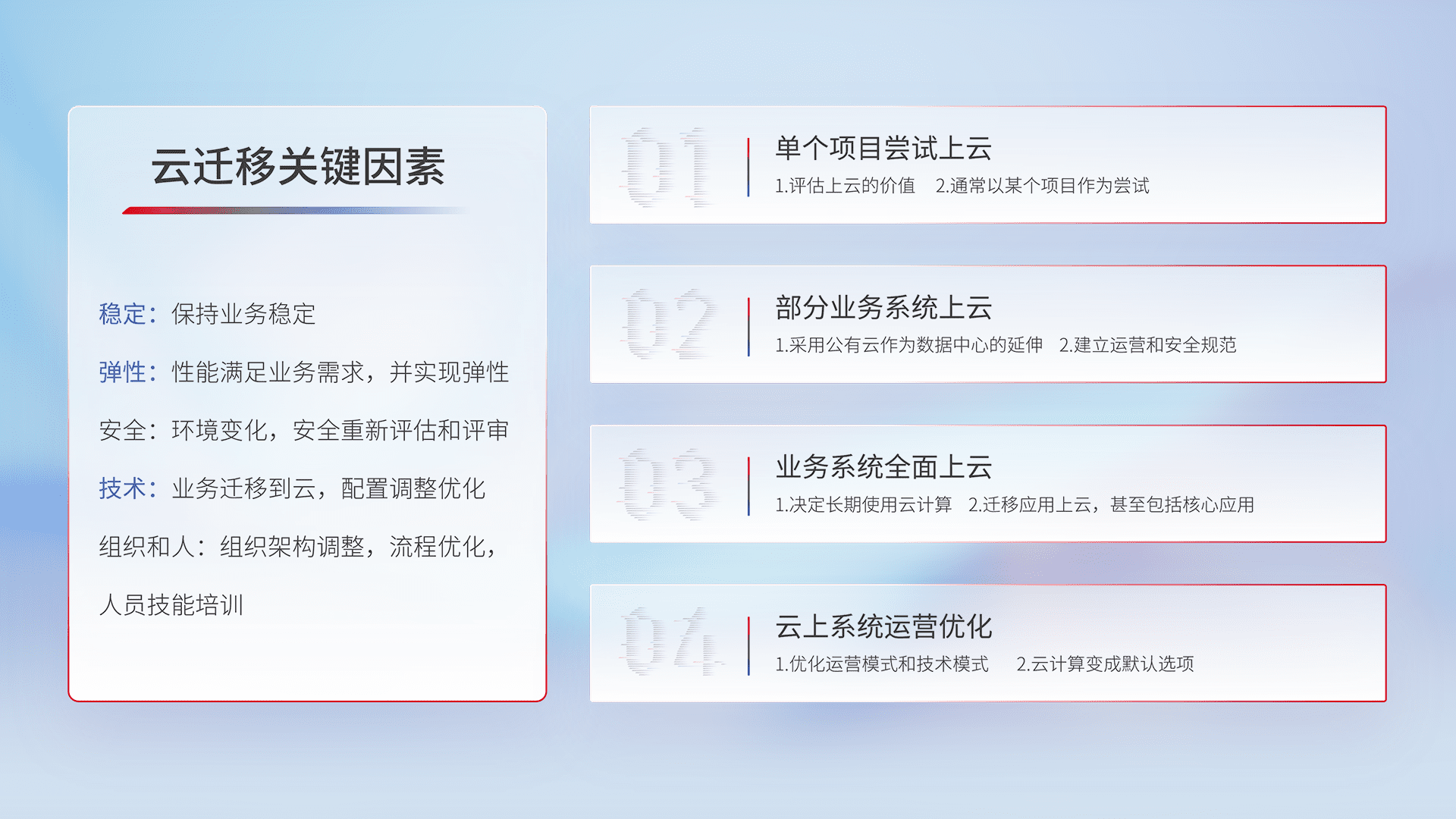 结合实际业务,,从规划设计、、、、云平台选型、、云原生改造、、数据迁移、、、、集成交付,,,迁移全过程为客户识别最佳上云路径,,,,做好风险识别管理,,设计网络架构、、身份权限、、、安全审计合规、、、、操作审计、、日志审计、、、、监控告警策略、、多站点容灾设计等,,,对云上基础设施进行整体规划,,,提升IT治理水平,,,以满足弹性、、、高可用、、、、高性能的需求。。。。