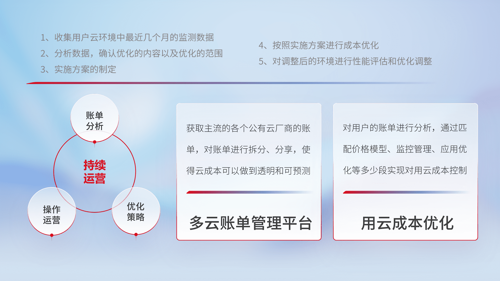 通过多云纳管,,,,以统一的资源数据模型把客户的云资源进行抽象和封装,,,,进而实现对多云资源的统一操作,,,,保障云资源管理的可靠性、、、稳定性与可用性。。。量身定制化运维内容,,配置、、、、开发运维、、、、补丁管理、、、备份、、、、监控、、、、认证和访问管理、、、、审计和日常巡检等,,,保障在用云过程中的可靠度,,,稳定度以及高可用率。。。。
